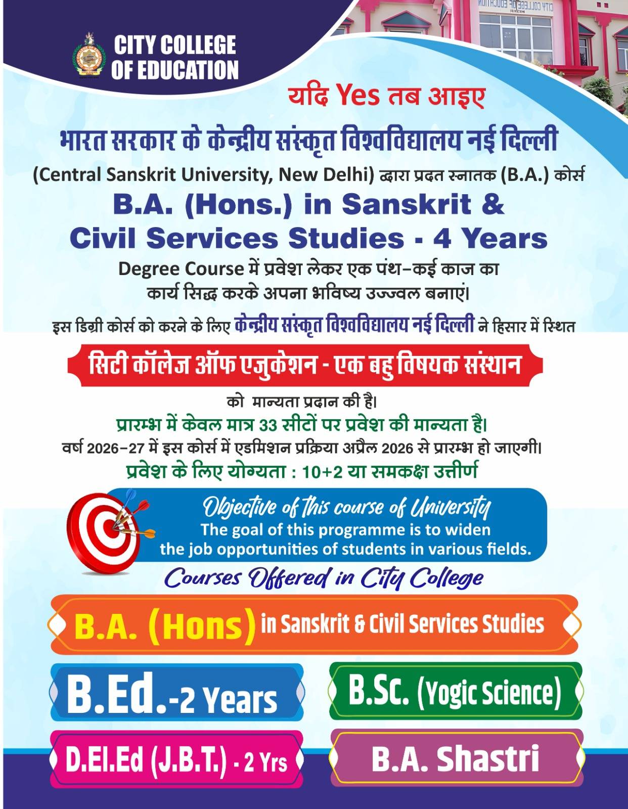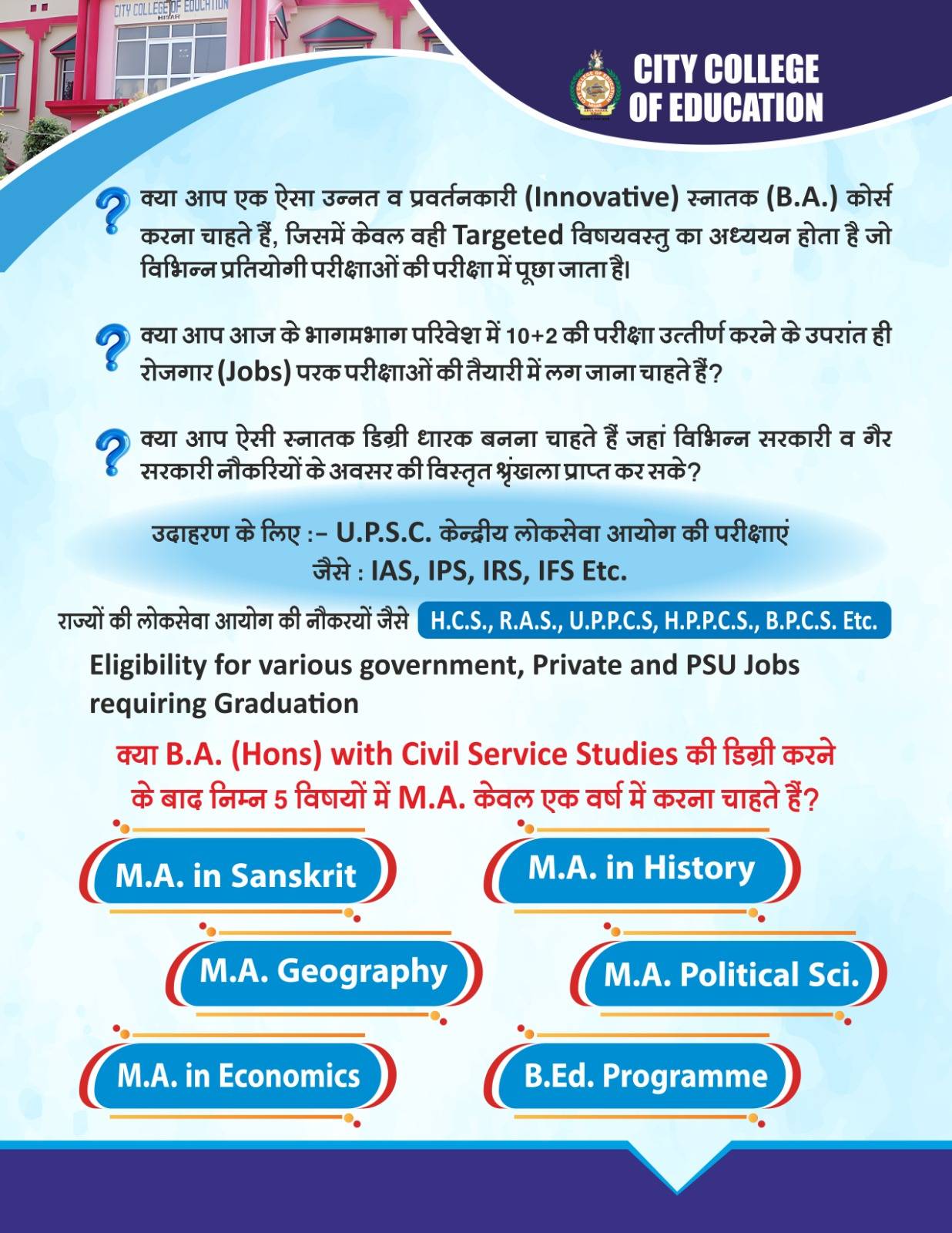 City College of Education in Hisar offers a comprehensive B.A.B.Ed program, fostering future educators with a blend of arts and education expertise.